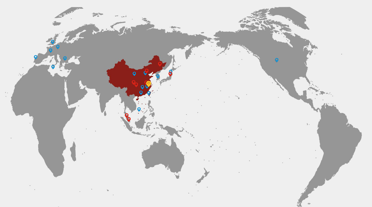 East China: Zhejiang (Hangzhou, Ningbo, Yixing, and Zhuji), Shanghai, Jiangsu (Nanjing, Suzhou, Wuxi, Jiangyin, Changzhou, Nantong, and Suqian), Anhui (Hefei and Chuzhou), Fujian (Xiamen, Quanzhou), and Shandong (Qufu)